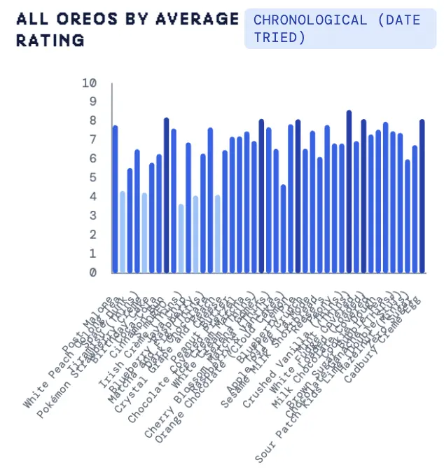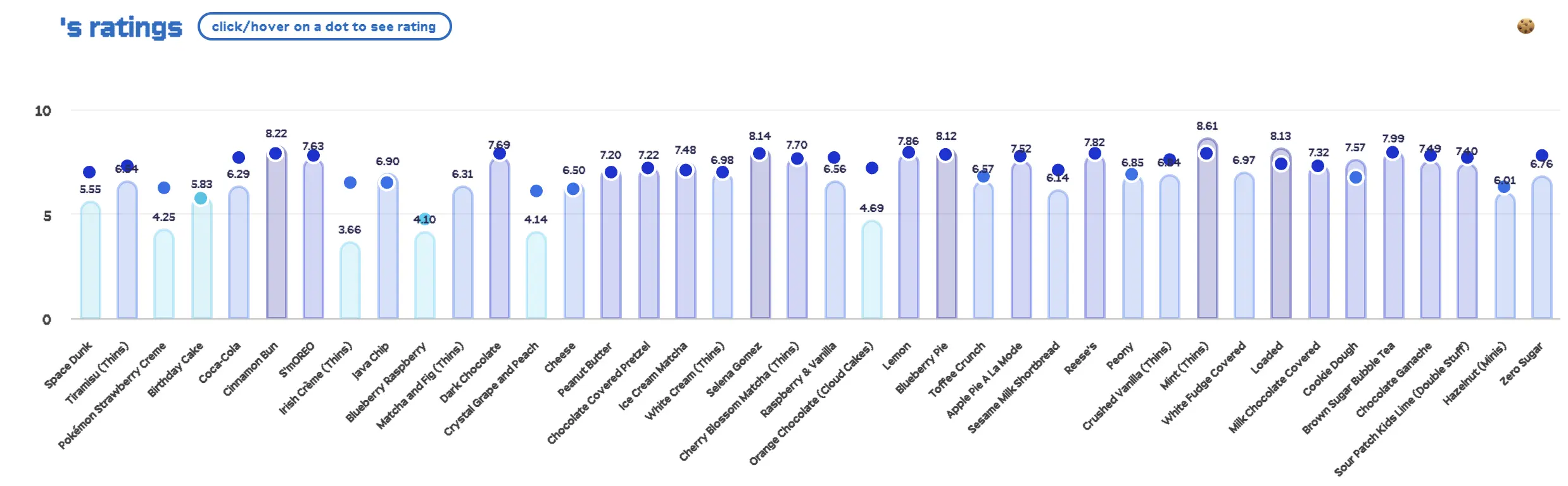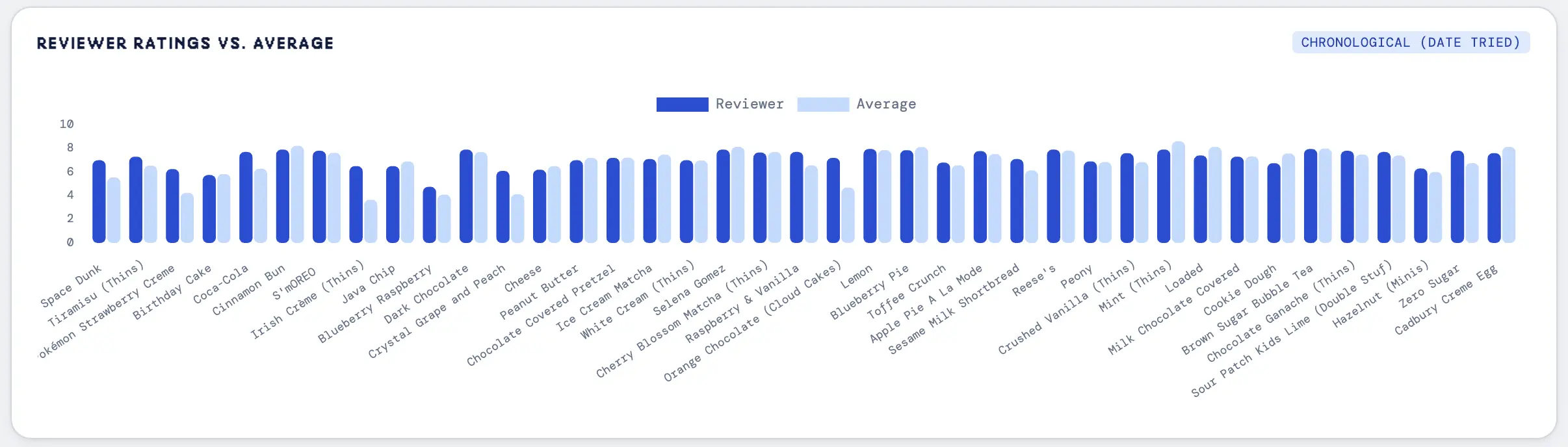 it all started one day at work in early 2025 when the Post Malone Oreos had just come out. my friend (jayjay on the dashboard, in case anyone's curious) offered to bring them in and they were (spoiler alert) amazing. a few days prior, i had actually bought the White Peach Oolong Tea ones from H Mart and they were (again, spoiler alert) disgusting. so, to balance it out, i naturally brought mine in too. we then asked ourselves, "what if we turned this into a thing and try a new Oreo every week?" every week, we tried a new flavor, my friend recorded everyone's scores in a little Excel spreadsheet, and our tasting group slowly grew larger. with all that information, i knew i could probably create a dashboard of sorts to better analyze and consolidate everything.