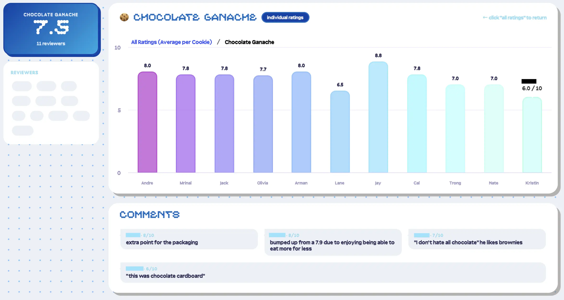 > now to the flavors page. to start, i populated a dropdown with all the flavors, where selection leads to the flavor's detail page. i recreated the original page, but changed the bar chart to a scatter and line plot (scatter for individual ratings, line for average) and also included cards for general stats (average rating, number of reviewers, standard deviation, percentile), like on the overview page. i did something similar for the reviewers page, e.g. stats, charts, and comments. one notable difference from the original design is that i moved away from the scatter point overlay and instead used a bar chart to represent the comparison. i felt this was a much easier way to visualize the data.