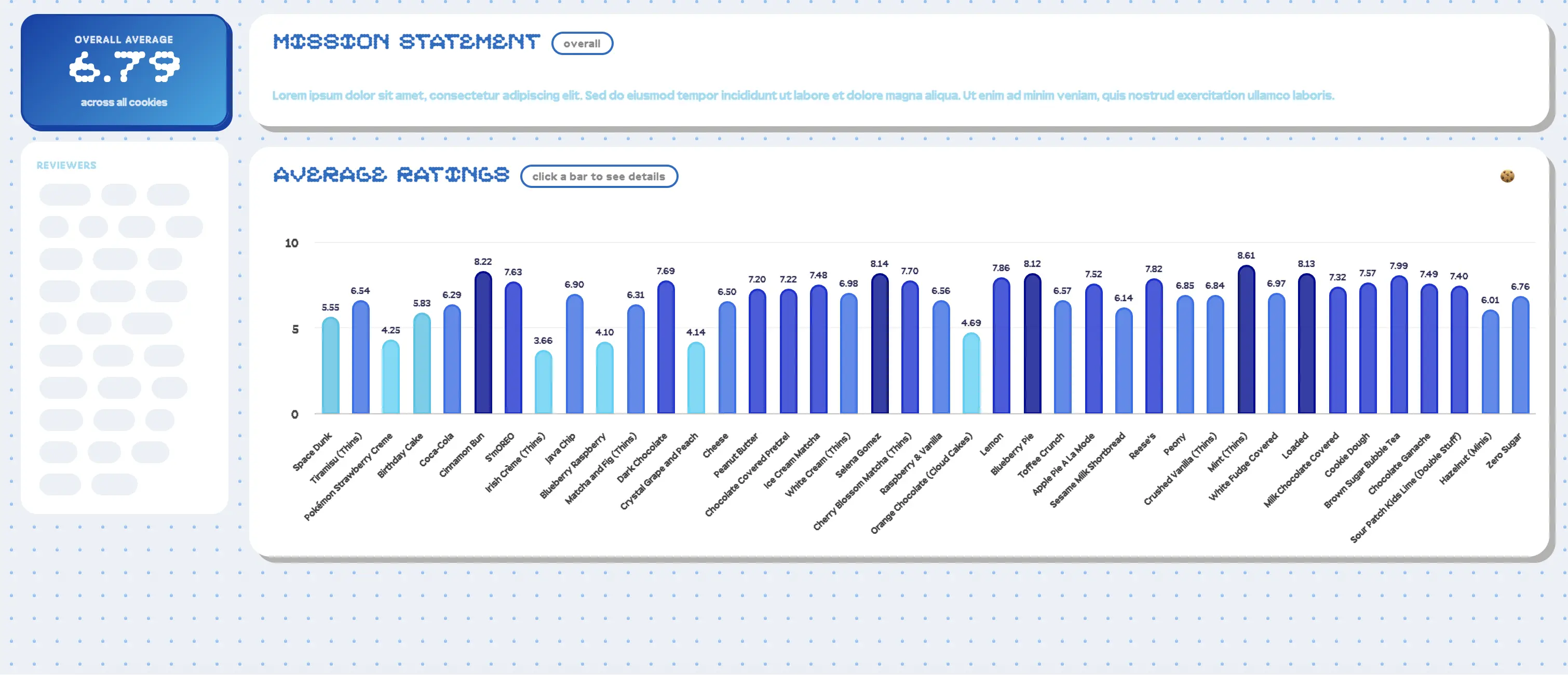 > similar to Highcharts, Chart.js has some very useful documentation. using the bar charts code as a reference, i recreated the original graph with all the flavors. i also added some standalone cards for general stats (total number of flavors, total number of reviewers, average rating of all flavors, favorite flavor, least favorite flavor, and most controversial flavor).